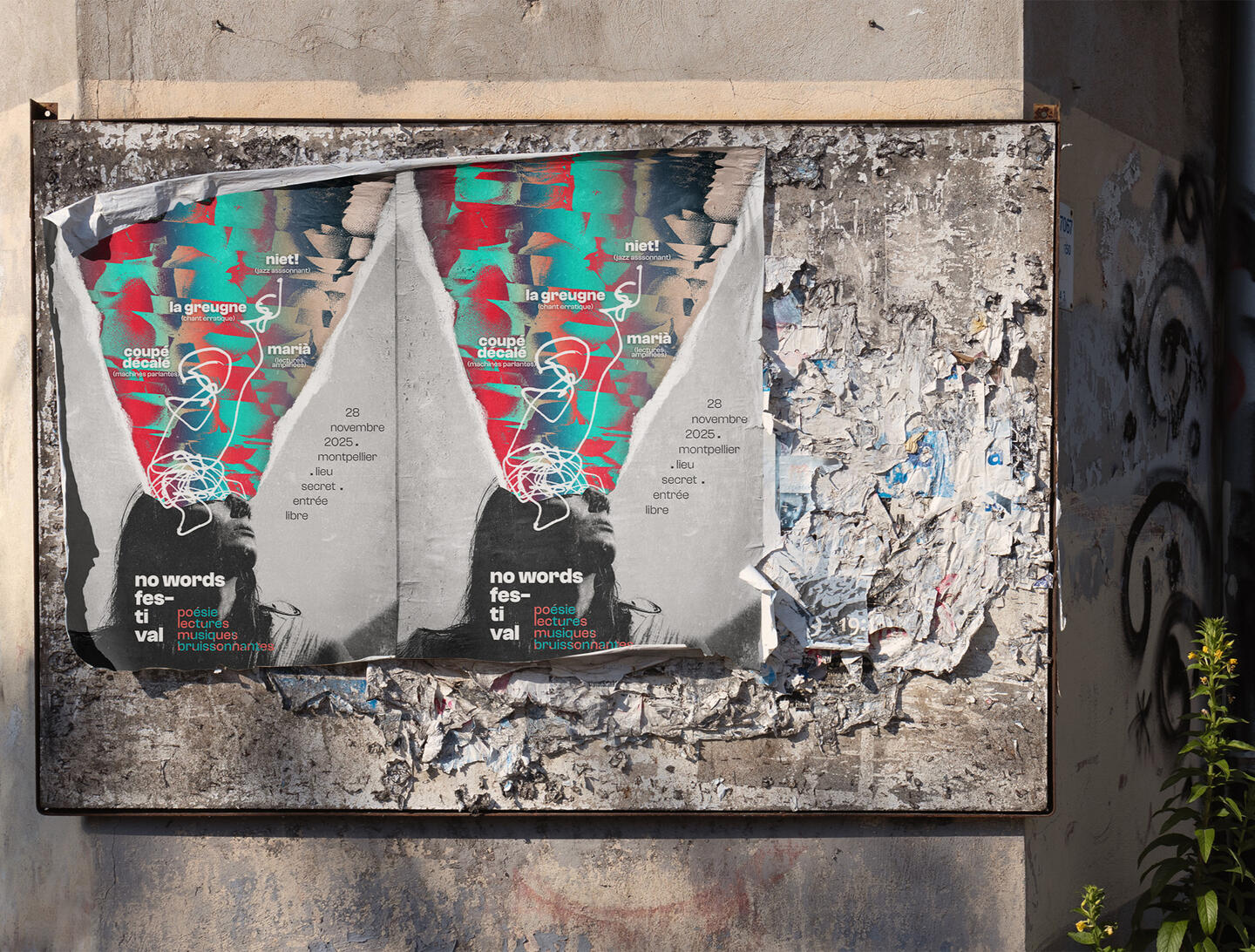 Projet d’affiche A2 pour un festival de poésie et musique improvisée. Textures scannées/recomposées, motifs abstraits acryliques, compositing numérique.