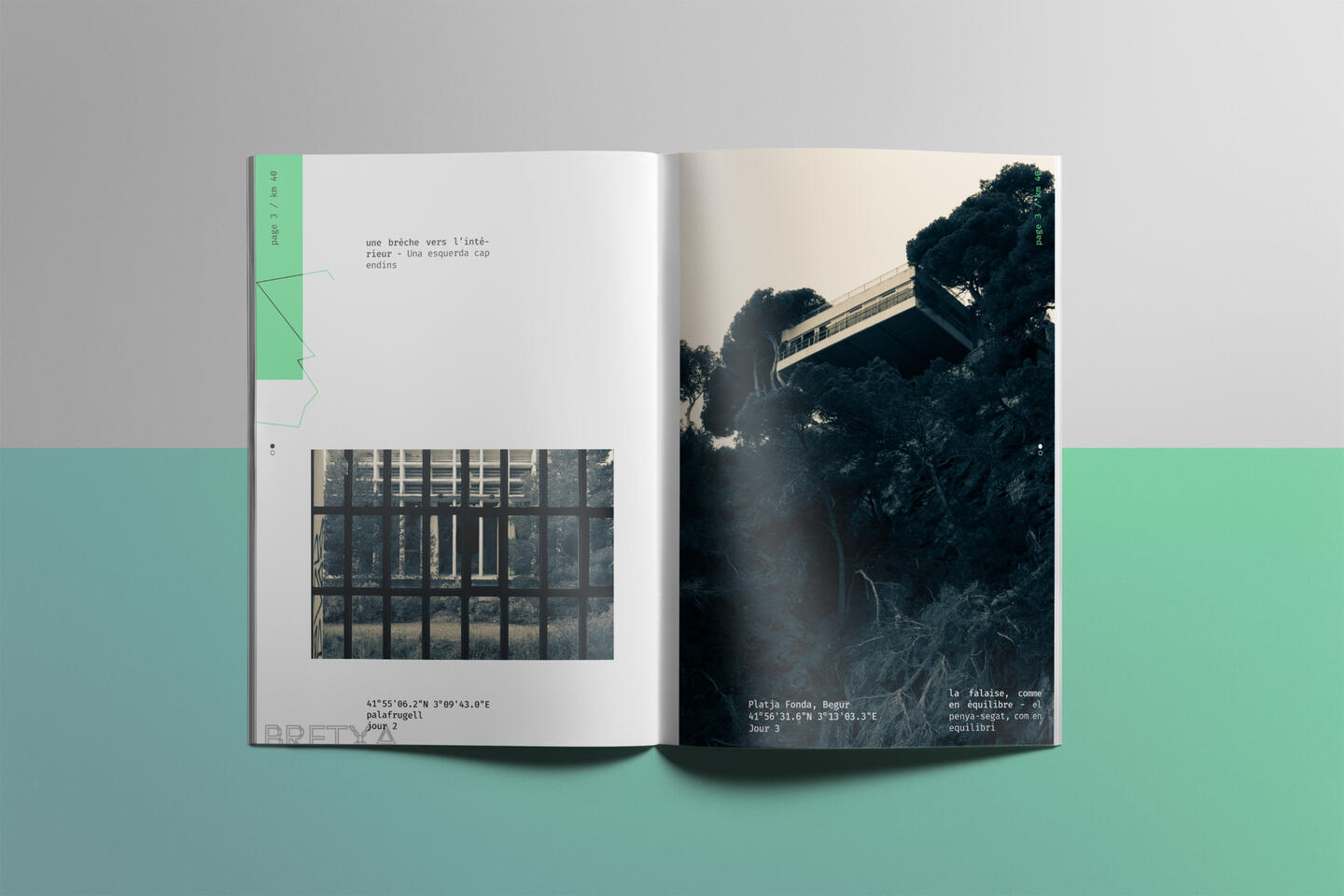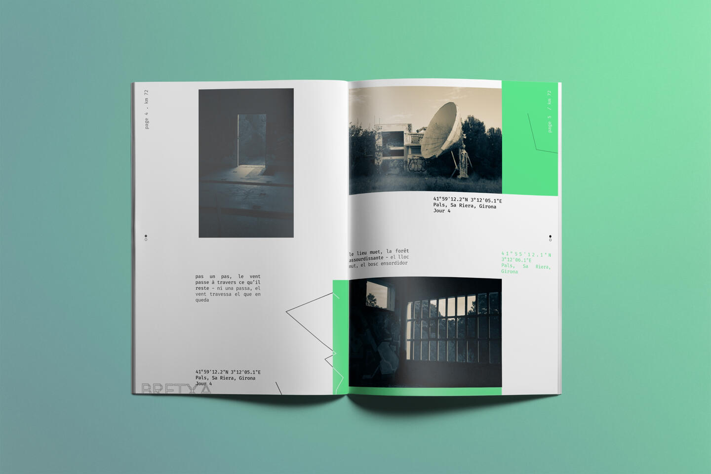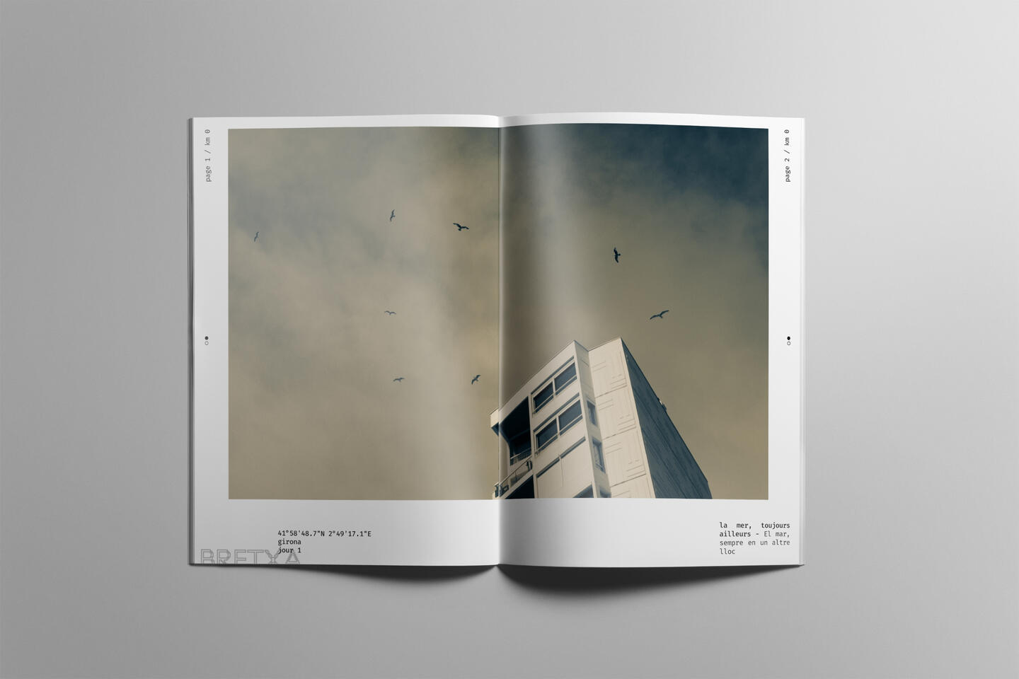 Fanzine basé sur des photos personnelles (GX80, 50mm, N&B split-tone). Composition guidée par un trajet cartographié, GPS et courts textes. Travail sur la grille.